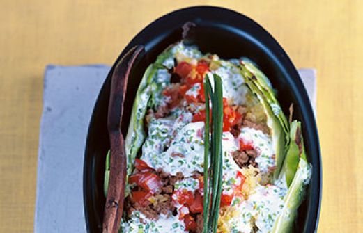Überbackener Spitzkohl mit Tatar Zutaten 1 Zwiebel 1 EL Olivenöl 200 g Tatar Salz Pfeffer 300 g Tomaten 1/2 Bund Schnittlauch 1 kleiner Spitzkohl (ca. 400 g) 100 ml Gemüsebrühe 50 g Frischkäse (16 % Fett absolut) guk:similarity-keywords=""> 1 Zwiebel , 1 EL O [...]