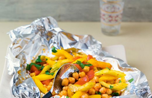 Würziges Kichererbsengemüse Zutaten 1 Dose Kichererbsen (240 g Abtropfgewicht) 1 Tomate 1 Paprikaschote (rot oder gelb) 2 Stangen Staudensellerie 1 EL Zitronensaft 1 EL Olivenöl 1 TL edelsüßes Paprikapulver Salz Pfeffer 1/2 Bund Petersilie 4 Stücke Alufolie (ca. 30 x40 c [...]