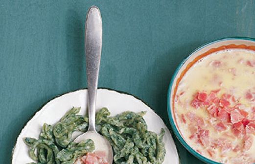 Spinatspätzle mit Schinken Zutaten 300 g blanchierter Spinat (gut ausgedrückt) 300 g Mehl 3 Eier 100 ml Milch Salz 1 kleine Zwiebel 200 g gekochter Schinken 40 g Butter ⅛ l Weißwein 150 g Sahne Salz Pfeffer, frisch gemahlen Parmesan, frisch gerieben guk:similarity [...]