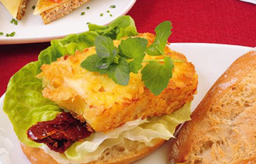 Sandwich mit Knusperkäse Zutaten 4 Blätter Kopfsalat 4 Blätter frische Minze 6 grüne Oliven (ohne Stein) 4 getrocknete Tomaten in Öl 40 g Kartoffelchips (ohne Geschmacksverstärker) 40 g Mehl 1 Ei 150 g Halloumi (griechischer Grillkäse) 2 EL Öl 2 Baguette-Brötchen 30 g Sala [...]