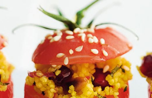 Tomaten mit Couscous-Salat Zutaten 8 mittelgroße Strauchtomaten 150 ml Gemüsebrühe ca. 1/2 TL Safranfäden 100 g Instant-Couscous 30 g Pinienkerne 1/2 Granatapfel 1 rote Zwiebel 1 Knoblauchzehe 4 EL Olivenöl 2 EL Balsamico bianco 2 EL frisch gehackte Minze 1 TL Honig Salz [...]