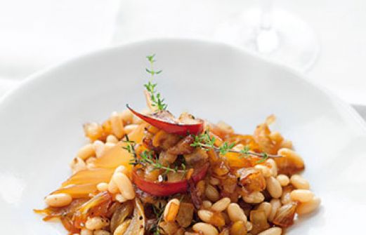 Weiße Bohnen mit karamellisierten Essigzwiebeln Zutaten 300 g getrocknete weiße Bohnenkerne 2 große Knoblauchzehen 4 Gewürznelken 2 Zweige Rosmarin 1 Gemüsezwiebel (ca. 400 g) 2 EL brauner Zucker 2 EL Olivenöl 200 ml Apfelessig ¼ l Apfelsaft ¼ l Gemüsebrühe Salz schwarzer Pf [...]