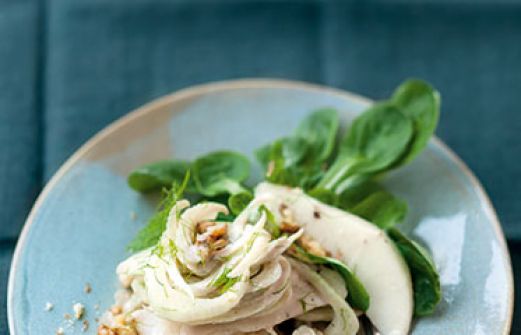 Fenchel-Birnen-Salat mit Ziegenfrischkäse-Dressing Zutaten 150 g Ziegenfrischkäse (ohne Rinde) 2 EL Apfelbalsam-Essig 4 EL Apfelsaft 2 TL Akazienhonig Meersalz grüner Pfeffer aus der Mühle 40 g Walnusskerne 50 g Feldsalat 400 g Fenchel 500 g aromatische, feste Birnen (z. B. [...]