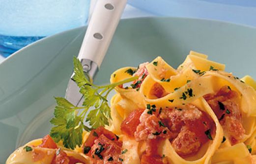 Bandnudeln mit Tomaten-Käse-Sauce Zutaten 400 g Bandnudeln Salz 1 große Dose geschälte Tomaten (800 g) 1 EL Olivenöl 80 g sehr frische Sahne oder Crème fraîche 100 g frisch geriebener Parmesan oder mittelalter Gouda oder gewürfelter Gorgonzola Pfeffer 1/2 Bund Petersilie gu [...]