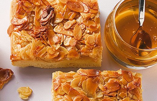 Bienenstich (ungefüllt) Zutaten 400 g Mehl 1 Würfel Hefe (ca. 40 g) 200 ml Milch Salz 125 g Zucker 1 Ei 150 g Butter Mehl zum Arbeiten Fett für das Blech abgeriebene Schale von 1 Bio-Zitrone 200 g Butter 250 g flüssiger Honig 6 EL Sahne 300 g Mandelblättchen guk:sim [...]