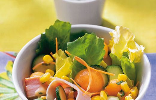 Zucchinisalat mit Melone Zutaten ¼ Endivien- oder Friséesalat 2 Zucchini (ca. 200 g) 1 Möhre ½ Honig- oder Charentais-Melone (ca. 300 g) 1 kleine Dose Mais (Abtropfgewicht 140 g) 4 Scheiben geräucherte Putenbrust (ca. 50 g) 2 EL Mayonnaise 2 EL Joghurt 1 EL Orangensaft 1 TL Z [...]