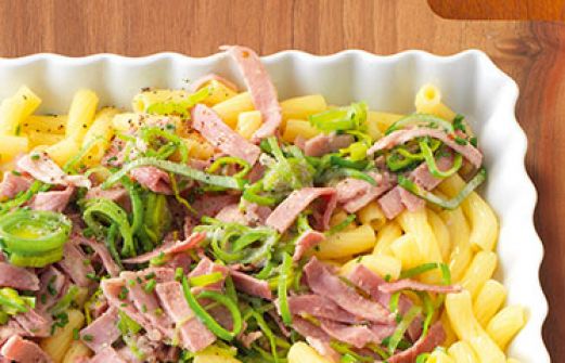 Lauch-Schinken-Pfanne mit Röhrennudeln Zutaten 1 Stange Lauch (150 g) 100 g gekochter Schinken 150 ml Gemüsebrühe 1 EL Rapsöl Pfeffer 1 TL Zitronensaft Jodsalz 300 g Röhrennudeln (ohne Gluten und Ei) 1 Bund Schnittlauch guk:similarity-keywords=""> 1 Stange Lauch (150 [...]