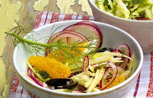 Fenchel-Orangen-Salat Zutaten 2 große Fenchelknollen (möglichst mit viel Grün) 50 g schwarze Oliven 1 rote Zwiebel 2 große Orangen 3 EL Apfelessig Salz Pfeffer 4 EL Olivenöl guk:similarity-keywords=""> 2 große Fenchelknollen (möglichst mit viel Grün) , 50 g schwa [...]