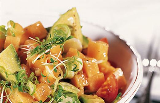 Avocado-Melonen-Salat Zutaten 1/2 kleine Honig- oder Zuckermelone (etwa 400 g) 2-3 Avocados (je nach Größe) 100 g Cocktailtomaten 1 Bund Frühlingszwiebeln 1 Stück frischer Ingwer (2-3 cm) 1 Kästchen Gartenkresse 3-4 EL heller Reisessig Salz, 1/2 TL Garam masala oder Fünf-Gewürz [...]