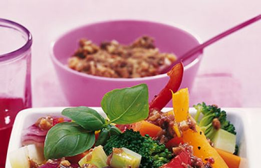 Gemüsesalat mit Sardellensauce Zutaten 200 g Kartoffeln (fest kochende Sorte) 250 g Brokkoli 200 g Möhren 2 Stangen Staudensellerie 1 Kohlrabi je 1 rote und gelbe Paprikaschote 2 rote Zwiebeln Salz 80 g Sardellenfilets in Öl 4 Knoblauchzehen 1/2 Bund Basilikum 80 ml Ol [...]