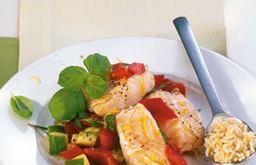 Kabeljau-Ratatouille Zutaten 300 g Kabeljaufilet 1 unbehandelte Zitrone 1 kleine Aubergine (250 g) 1 Zucchino (150 g) 1 große rote Paprikaschote 1 Knoblauchzehe 1/2 Bund Basilikum 1 EL Olivenöl 1 TL Kräuter der Provence Jodsalz Pfeffer guk:similarity-keywords=""> 3 [...]