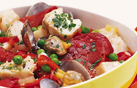 Fischtopf mit Chorizo Zutaten 500 g Venusmuscheln 1/4 l Fischfond 500 g Fischfilet (z. B. Seelachs, Kabeljau, Steinbeißer oder Seehecht) 1 EL Zitronensaft Salz Pfeffer aus der Mühle 150 g Chorizo (spanische Paprikawurst) 1 Zwiebel 4 Knoblauchzehen je 1 rote und grüne Paprik [...]