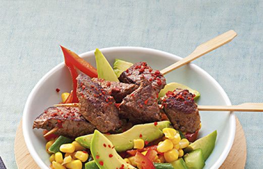 Maissalat mit Rindfleisch, Gurke und Paprika und Avocadostreifen Zutaten 1 Knoblauchzehe 1 EL Zitronensaft 1/2 TL Senf 3 EL Rinderbrühe 50 g Rindersteak 1 TL Olivenöl 150 g Maiskörner (Dose) 1 kleine rote Paprikaschote 1 kleine Salatgurke 1 kleine reife Avocado Chilipulver [...]