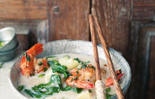 Spinat-Kokos-Suppe mit Garnelen Zutaten 1 mehligkochende Kartoffel 2 Schalotten 2 Knoblauchzehen 1 Stück Ingwer (ca. 2 cm) 2 grüne Chilischoten 4 EL Butter 800 ml Gemüsebrühe 300 ml Kokosmilch 300 g Blattspinat 5- 6 Stängel Koriandergrün 12 rohe, küchenfertige Garnelen [...]