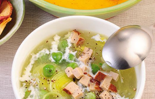 Erbseneintopf mit Räuchertofu Zutaten 1 Zwiebel 1 Knoblauchzehe 1 Stange Lauch 1 mehligkochende Kartoffel (ca. 80-100 g) 1/2 l Gemüsebrühe (Instant) 300 g TK-Erbsen 1 TL gehacktes Bohnenkraut 150 g Räuchertofu 2 EL Sahne 1 El Aceto Balsamico bianco 1 TL Ingwerpulver Sal [...]