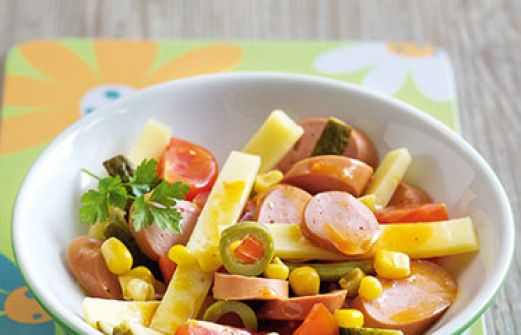 Tomaten-Wurst-Salat Zutaten 300 g Puten-Wiener 150 g Emmentaler am Stück 4 Cornichons 1 kleine rote Zwiebel 1 Dose Mais (ca. 140 g Abtropfgewicht) 6 grüne, paprikagefüllte Oliven (Glas; nach Belieben) 8 Kirschtomaten 3 EL Weißweinessig 2 EL Tomatenketchup Salz Pfeffer 4 [...]