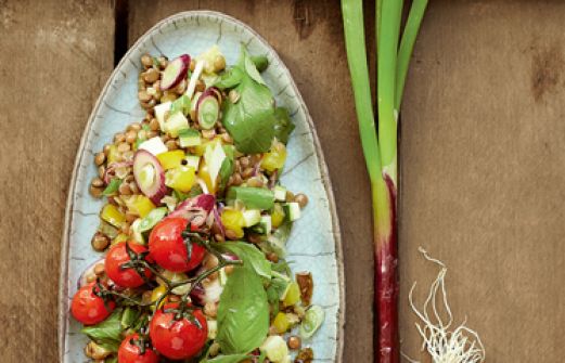 Linsensalat mit Basilikum Zutaten 200 g Berglinsen (Le Puy-Linsen) Salz 1 Bio-Zitrone ½ TL gemahlener Koriander 3-4 TL Honig 1 Knoblauchzehe 5 EL Olivenöl Pfeffer 1 gelbe Paprikaschote 1 kleiner Zucchino 2 Bund Basilikum ½ Bund Frühlingszwiebeln 250 g Cocktailtomaten [...]
