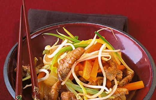 Schweinefleisch süßsauer Zutaten 2 Möhren (ca. 300 g) 2 kleine Stangen Lauch 1 Knoblauchzehe 1 walnussgroßes Stück Ingwer 100 g frische Sojasprossen 1 Dose Ananasstücke (580 g Inhalt) 6 EL Ketchup 2 EL neutrales Öl 400 g Schweinegeschnetzeltes Salz Pfeffer Sojasauce g [...]