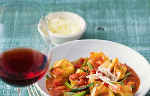 Tortellini mit Gemüse-Bolognese Zutaten 2 Knoblauchzehen 1 kleine, getrocknete Chilischote je 150 g Möhren, Zwiebeln, Staudensellerie, Lauch und rote Paprikaschoten 2 EL Olivenöl 1 große Dose Tomaten (480 g Abtropfgewicht) 50 ml Rotwein 150 ml Milch 150 ml Gemüsebrühe 1 EL To [...]