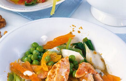 Puten-Geschnetzeltes mit Curry Zutaten 120 g Langkorn-Naturreis (parboiled) 200 g Putenbrustfilet 1 Bund Frühlingszwiebeln 3 getrocknete Aprikosen 2 EL Rapsöl Salz Pfeffer 1 TL Currypulver 150 g tiefgekühlte feine Erbsen 125 ml Hühnerbrühe 2 EL Schmand guk:similarity-k [...]