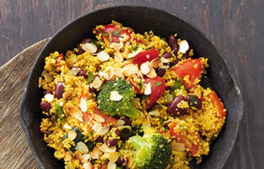 Curry-Hirse-Pfanne mit Gemüse Zutaten 1 Brokkoli (ca. 250 g) 1 Zucchino 2 rote Paprikaschoten 1 große Zwiebel 2 El Olivenöl 2 - 21/2 Tl indische Currypaste 200 g Hirse 450 ml Gemüsebrühe Salz Pfeffer 1 Dose Kidneybohnen (ca. 250 g Abtropf gewicht) 1/2 Bund Petersilie 4 [...]