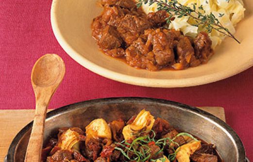 Rindergulasch mit Artischocken Zutaten 300 g Rindergulasch (aus der Keule) 300 g Zwiebeln 2 Knoblauchzehen 50 g getrocknete Tomaten in Öl 1 EL Olivenöl 2 EL Tomatenmark 1 TL Rosmarinnadeln 1 TL Thymianblättchen Salz Pfeffer 300 ml Rinderbrühe 1 Dose Artischockenherzen [...]