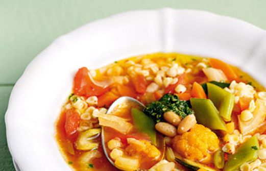Italienische Minestrone mit Bohnen und Muschelnudeln Zutaten 100 g breite grüne Bohnen 1 Möhre (100 g) 2 Stangen Staudensellerie (120 g) ½ Fenchelknolle (150 g) 1 weißes Stück Lauch (80 g) 200 g Blumenkohl 2 Tomaten (200 g) 3 EL Olivenöl Salz schwarzer Pfeffer 1 EL Tomat [...]
