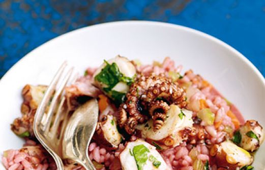 Rotweinrisotto mit Oktopus und Rote-Bete-Saft Zutaten 1 kg küchenfertiger Oktopus (Pulpo, Krake, frisch oder tiefgekühlt) 6-8 Stängel glatte Petersilie 1 Knoblauchzehe 2 Lorbeerblätter Meersalz (z.B. Fleur de Sel) 1 rote Zwiebel (80 g) 1 kleine Möhre (80 g) 1 Stange Staudensell [...]