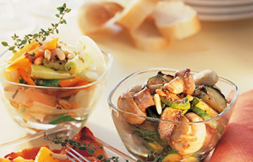 Mariniertes Gemüse Zutaten 3 Paprikaschoten 1 Bund Frühlingszwiebeln 1 Fenchelknolle 3 kleine, schmale Zucchini (etwa 250 g) 2 kleine Möhren (etwa 200 g) 200 g kleine Champignons Salz 1/8 l kalt gepresstes Olivenöl schwarzer Pfeffer 6 Knoblauchzehen 1/2 Bund Thymian 7 [...]