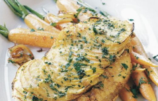 Rotbarschfilet mit Apfelkruste Zutaten 4 Rotbarschfilets (á ca. 200 g) Saft von 1/2 Zitrone 750 g Bund-Möhren 2 Zwiebeln 3 Esslöffel Öl 1 Prise Zucker Salz Pfeffer 2 feinsäuerliche Äpfel 20 g Semmelbrösel 30 g geriebener Parmesankäse 30 g Butter 1/2 Bund Petersilie [...]