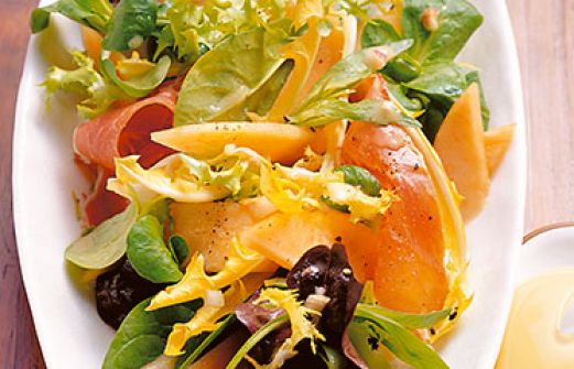 Blattsalat mit Melone und Estragon Zutaten 250 g gemischter Blattsalat 1/4 Honig- oder Zuckermelone (ca. 250 g) 1 Schalotte 5 Zweige Estragon 1 TL scharfer Senf 2 EL Weißweinessig Salz Pfeffer 1/2 TL Honig 4 EL Olivenöl 100 g roh geräucherter Schinken in dünnen Scheiben g [...]