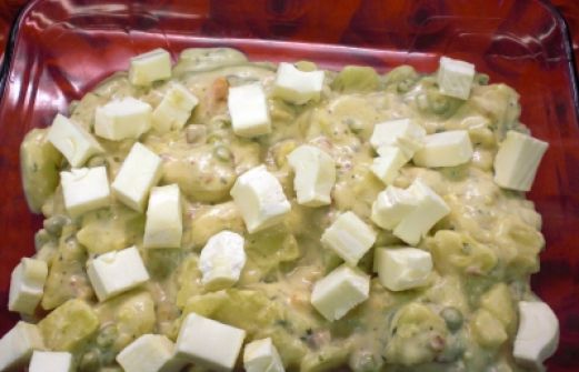 Menge Zutat 800 g Kartoffeln 1 Dose Erbsen und Möhren 200 g Sahne 400 g Gemüsebrühe 200 g Weichkäse 1 EL getrocknete Petersil [...]