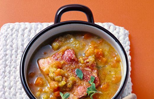 Erbseneintopf mit Kürbis und frischem Majoran Zutaten 500 g Muskatkürbis (ergibt geputzt etwa 380 g) 100 g Zwiebeln 1 TL Butter 150 g getrocknete grüne Schälerbsen 800 ml Gemüsebrühe 1 Scheibe geräucherter Bauchspeck am Stück (80 g) 2 Zweige frischer Majoran Salz schwarzer P [...]
