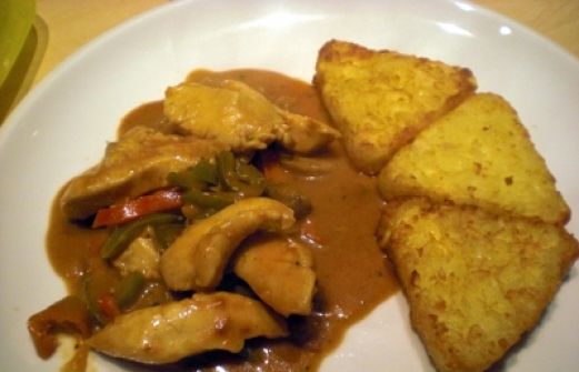 Menge Zutat 500 g Hähnchenbrustfilet 1 Zwiebel 1 rote Paprikaschote 1 gelbe Paprikaschote 1 grüne Paprikaschote 300 g Champigno [...]