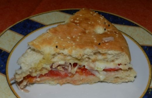 Menge Zutat 1 St Rundes Fladenbrot 1 Pk Kräuterbutter 3 Schb Kochschinken oder Salami (in Streifen) 1 Dose Thunfisch (abgetropft u. zerpflückt) 1 St Zwiebel (i [...]