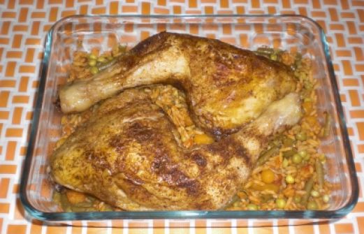 Menge Zutat 8 St Hähnchenoberschenkel 2 EL Öl 1 St Zwiebel gehackt 2 St Knoblauchzehen, fein gehackt 175 g Langkornreis 225 ml Hühn [...]