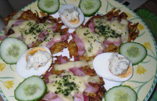 zutaten_2sp"> Zutaten für Personen Rezept mit Bild: Rösti überbacken Bild einstellen 800 g Kartoffeln 2 Möhren 2 Eier 3 EL Mehl Salz Pfeffer Öl 200 g Schinken gekocht 150 g Gouda [...]