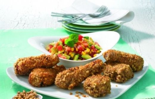 Menge Zutat 200 g Walnüsse 4 EL Paniermehl 50 g Ingwerknolle 8 Hähnchenunterkeulen à 100 g 4 Eier 80 g Mehl [...]