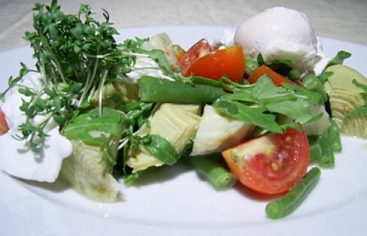 Menge Zutat 125 g Brechbohnen 1 EL Essig 125 g Kirschtomaten 50 g Rucola oder Brunnenkresse 3 Artischockenherzen 1/2 TL Senf [...]