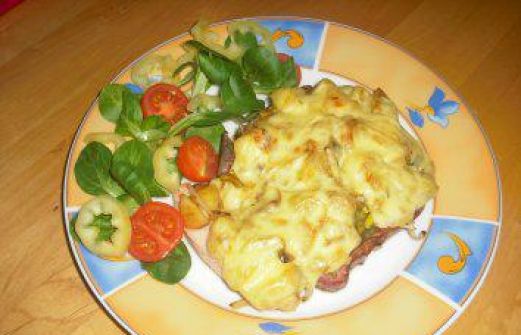 zutaten_2sp"> Zutaten für Personen Rezept mit Bild: Kasseler Hawaii Bild einstellen 2 Kasselerkotelett etwas Lauch Ananas frisch Zwiebel Salz, Pfeffer, etwas Chili 2 Scheiben Gouda R [...]