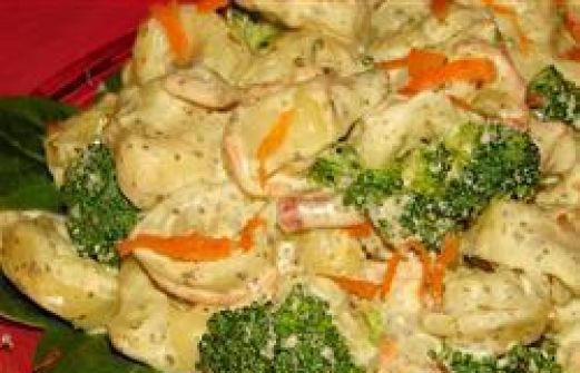 Portionen : 6 1 Packung kochfertige Käsetortellini (275 g) 1 kleine rote Paprikaschote, in feine Streifen geschnitten 75 g Brokkoliröschen 45 g fein geraspelte Karotte 45 g entsteinte grüne Oliven 1 Knoblauchzehe, gehackt 120 g fertige Mayonnaise 60 g fertiges Pesto [...]