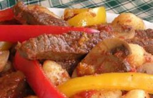 Portionen : 4 2 EL Olivenöl 450 g Rindersteak, in dünne Streifen geschnitten 1 Zwiebel, in dünne Scheiben geschnitten 1 TL Knoblauch, fein gehackt 170 g Champignons, in Scheiben geschnitten 1 rote Paprika, in Streifen geschnitten 1 gelbe Paprika, in Streifen gesch [...]