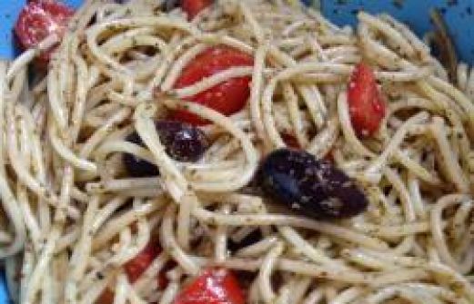 Portionen : 4 250 g Spaghetti ca. 2-3 EL Pesto 1 rote Paprika, gewürfelt 1-2 Tomaten oder Cocktailtomaten (dann mehr), gewürfelt bzw. halbiert 1-2 EL Olivenöl schwarze Oliven nach Geschmack Salz und Pfeffer nach Geschmack Zub.: 10 Min. | Kochzeit: 10 Mi [...]