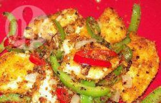 Portionen : 2 3-4 Hähnchenbrustfilets, in mundgerechte Stücke geschnitten 90 g Semmelbrösel 3 EL Sonnenblumenöl (oder Olivenöl) 1 große Zwiebel, klein gehackt 1 große grüne Paprika, in Streifen geschnitten 2 Knoblauchzehen, fein gehackt 2 grüne oder rote Chilischo [...]