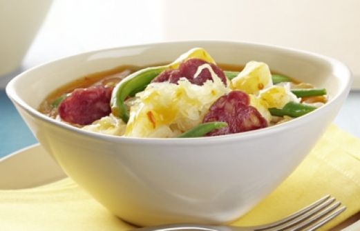 Menge Zutat 200 g grüne Bohnen Salz/ Pfeffer 1 Zwiebel 200 g Chorizo (ersatzweise Cabanossi) 2 EL Öl 750 g Sauerkraut (frisch od [...]