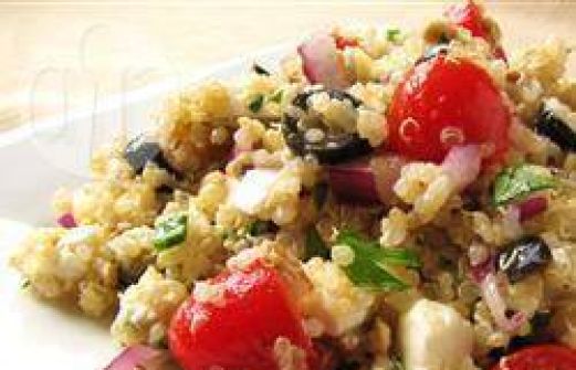 Portionen : 6 170 g Quinoa 500 ml Wasser 1/2 TL Salz 100 g Kirschtomaten, halbiert 50 g schwarze Oliven, entkernt und in Scheiben geschnitten 125 g Feta, zerkrümelt 4 EL geröstete Sonnenblumenkerne 1 EL Schalotte, fein gehackt 4 EL frische Petersilie, geha [...]
