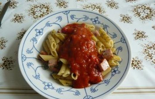 zutaten_2sp"> Zutaten für Personen Rezept mit Bild: Schinkennudeln Bild einstellen 250 Gramm Nudeln Penne 300 Gramm Bierschinken am Stück 1 Glas fertige Tomatensoße 2 Zwiebeln frisch Kräuter der Pr [...]