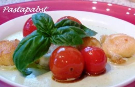 zutaten_2sp"> Zutaten für Personen Bild einstellen 800 ml Sahne 6 Blatt Gelatine weiß 1 großer Topf Basilikum 3 EL Zucker 6 EL Balsamico-Essig weiß 32 Cherrytomaten 32 Mozzarellakugeln 2 Eier Mehl Panierm [...]