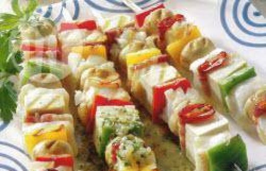 Portionen : 4 600 g Filet vom Schwarzen Heilbutt 400 g Tofu je 1 rote, grüne und gelbe Paprikaschote 12 kleine Champignons 12 Scheiben Speck 4 EL Sesamöl 3 Schalotten 75 ml trockener Weißwein 3 EL Zitronensaft 1 EL Sojasauce je 1 EL gehackter Estragon, Kerbel [...]