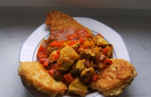 zutaten_2sp"> Zutaten für Personen Bild einstellen 500 g 500g frische Hähnchenbrust 2 frische Paprikaschoten 1 Zwiebel 2 Zehen Knoblauch 4 frische Tomaten 2 EL Tomatenmark 250 Millilitter Gemüsebrühe 200 g Blattspi [...]